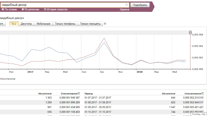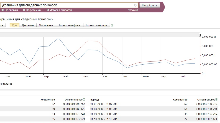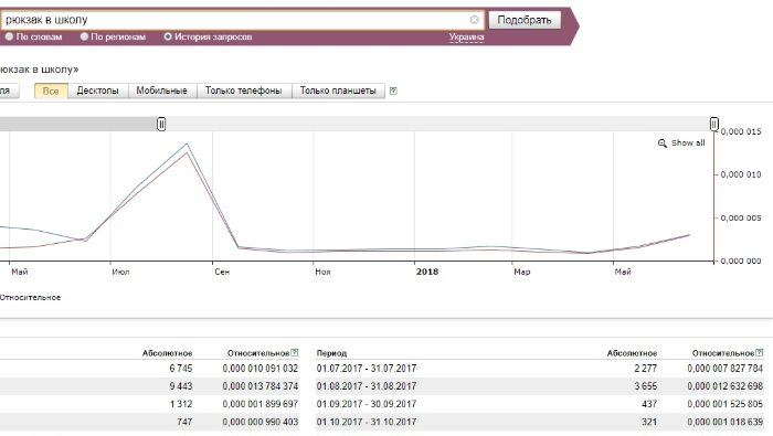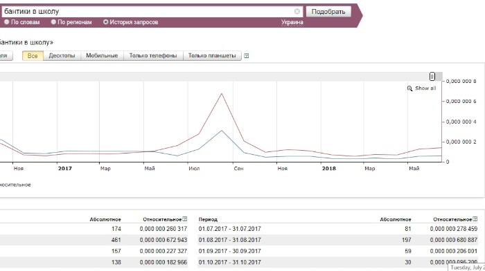 Спрос очевиден – мамы начинают присматривать товары к 1 сентября уже в июле-августе. Аксессуары для прически – одна из важнейших покупок, ведь каждая мама хочет, чтобы ее дочка была самой красивой на торжественной линейке. В это время очень популярны бантики, заколки, ободки в классической «школьной» черно-белой и сине-белой гамме. Рукодельницы, которые предпочитают не купить оптом детские аксессуары, а сделать их своими руками, покупают заготовки для обручей и заколок, атласные ленты, кабошоны и разнообразные стразы. На данный момент спрос не достиг своего пика, однако посмотрите, какой всплеск был в августе 2017-го года: