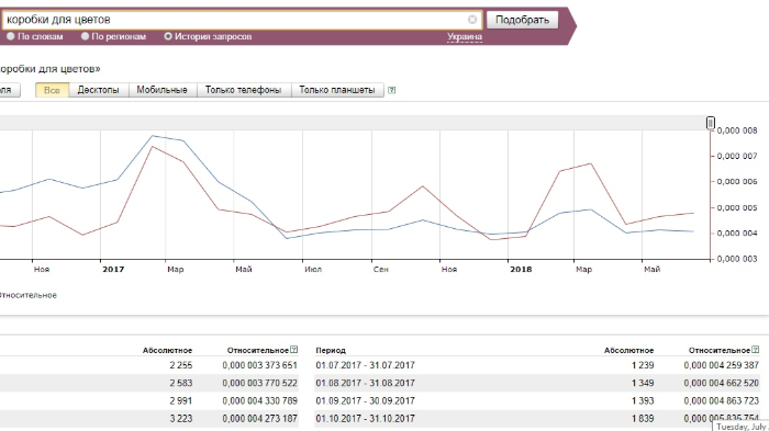 Несомненно, этот товар пользуется спросом круглый год, переживая свой всплеск накануне Восьмого марта. Однако есть весомый повод вдоволь закупиться им перед 1 сентября: учителям принято дарить цветы, а это значит, что клиентов у флористов будет много. А в начале октября еще одно событие – День учителя, что тоже прибавит покупателей. Также не забудьте пополнить ассортимент калькой и тишью. На графике хорошо заметен скачок спроса перед 8 марта и в период с августа по октябрь.
