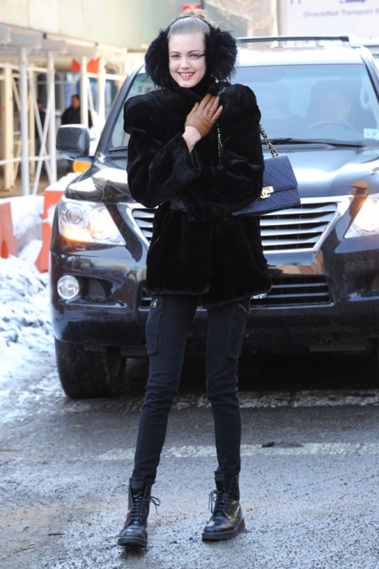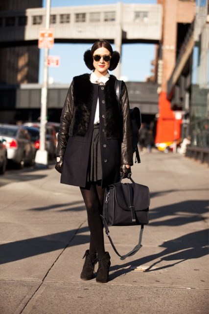 Молодые девушки могут красиво обыграть меховые наушники в городском стиле. Идеальный вариант – шубка или пальто с сапогами на плоской подошве с высоким голенищем или ботинками. Наушники придадут такому образу еще больше романтичности, женственности и задорного огонька.