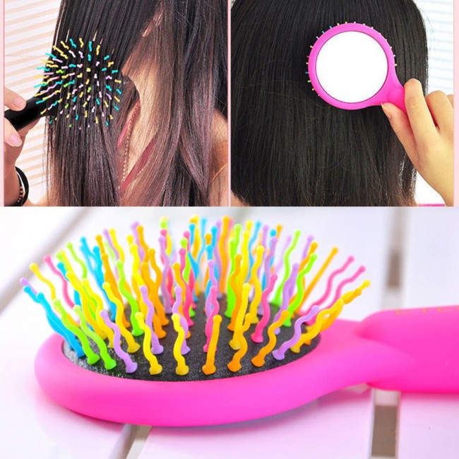 Секрет легкого расчесывания от Rainbow Volume Brush – искривленные пластиковые зубчики s-образной формы, которые бережно распутывают волосы (как сухие, так и мокрые), не травмируя кожу головы. При расчесывании они создают воздушное пространство, благодаря которому волосы становятся не только гладкими, но и объемными. Расческа очень удобно лежит в руке, ручка имеет гладкую приятную на ощупь структуру «soft touch», а сзади имеется небольшое зеркальце, что очень удобно в повседневной жизни.