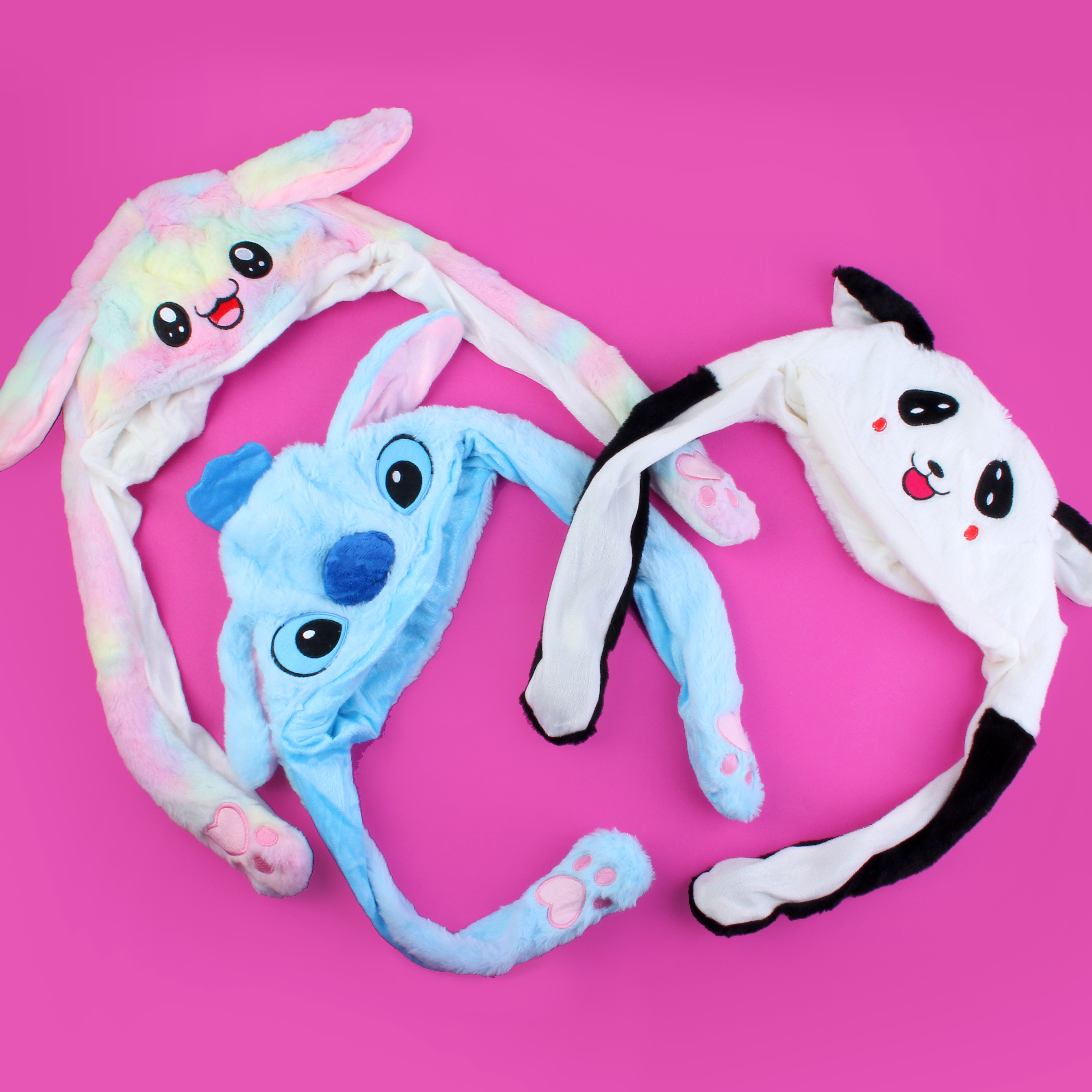 Шапка виконана у вигляді забавної мордочки з вухами і довгими лапами. В наявності три види шапок: Стіч з однойменного мультфільму «Ліло і Стіч», панда і зайчик. При натисканні на лапки вушка кумедно підстрибують: весь секрет у маленьких ручних насосах, прихованих всередині лапок на кінцях зав'язок. Ці рухи розвеселять кого завгодно! Також шапка має підсвічування з трьома режимами, яке вмикається за допомогою кнопки в лапці. Світловий елемент працює за рахунок знімних батарейок. Для того, щоб підсвітку можна було ввімкнути потрібно дістати з лапи спеціальний дістати запобіжник.Такі деталі надають шапці неймовірно яскравого і святкового вигляду!